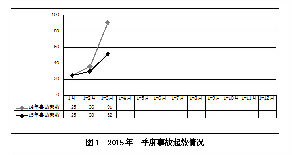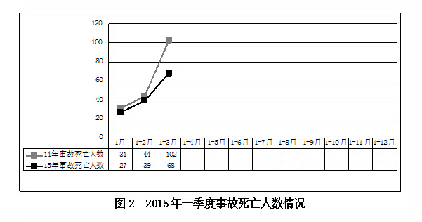2015年一季度,全国共发生房屋市政工程生产安全事故52起、死亡68人,比去年同期事故起数减少39起、死亡人数减少34人(见图1、图2),同比分别下降42.86%和33.33%。