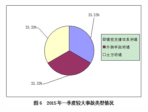 2015年一季度,共发生3起较大事故,其中模板支撑体系坍塌事故1起,死亡8人,分别占较大事故总数的33.33%和57.14%;土方坍塌事故1起,死亡3人,分别占较大事故总数的33.33%和21.43%;外脚手架坍塌事故1起,死亡3人,分别占较大事故总数的33.33%和21.43%。(见图6)。