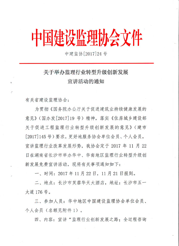 中国建设监理协会将于11月22日在湖南省长沙市举办监理行业转型升级创新发展宣讲活动(具体通知附后),主要是宣讲:监理行业创新发展之路;全过程咨询服务;BIM技术应用;团体标准建设;风险控制;政府和社会资本合作(PPP)等新型融资方式下的咨询服务等内容。我区有30个参会名额,参会人员应是中监协个人会员或所在企业是中监协单位会员。请有意向参加的企业于2017年11月2日前将报名回执(见附件)发送到我协会邮箱,待我协会与中国建设监理协会最终确定参会名额。本次会议免收会务费,食宿统一安排,费用自理。