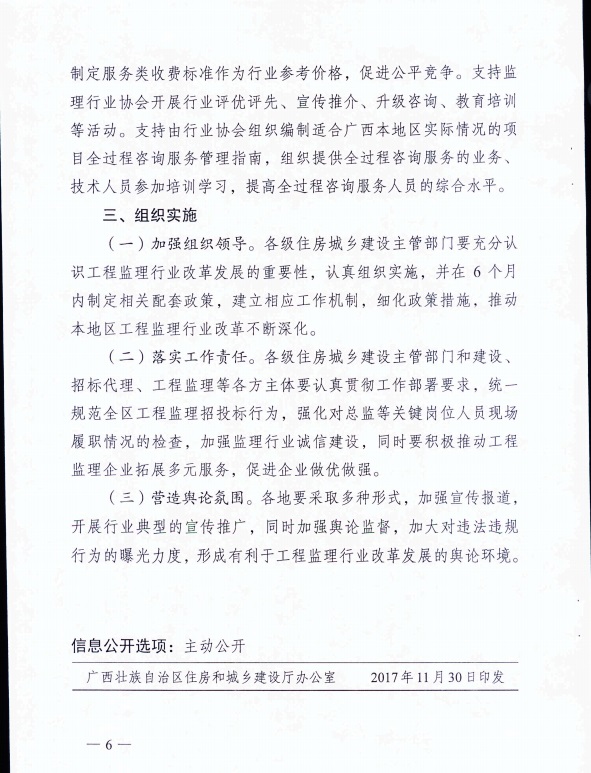 广西住建厅建管处发来《自治区住房和城乡建设厅关于征求促进工程监理行业转型升级创新发展实施方案(征求意见稿)意见的函》,委托我协会组织征求全区监理企业意见。现转发给你们,请各单位给予高度重视,组织人员认真研究,提出反馈意见,并于2017年12月8日前将书面意见送至(邮寄)我协会,同时将电子版发到协会邮箱。