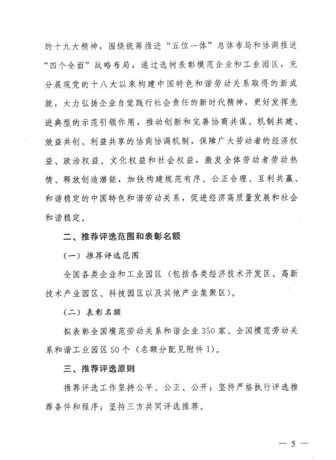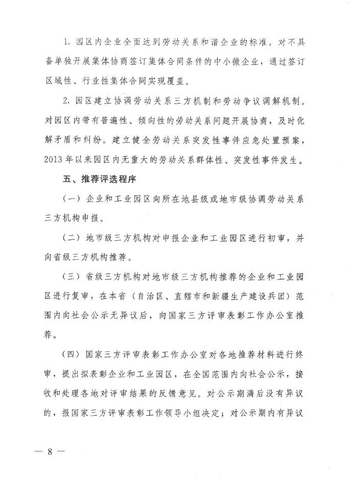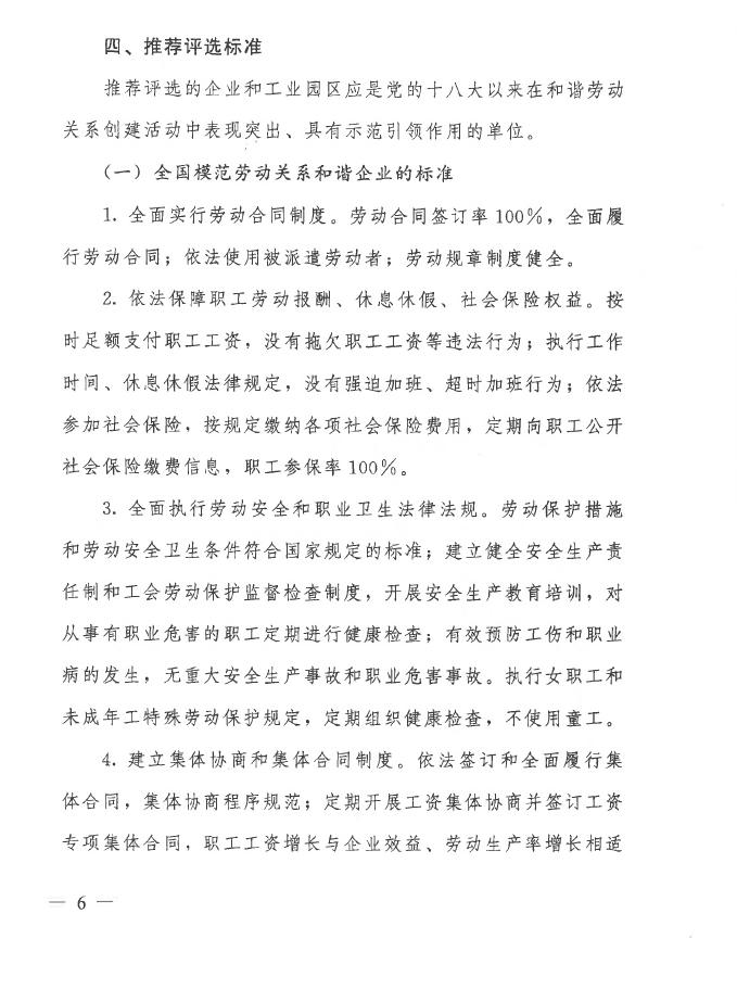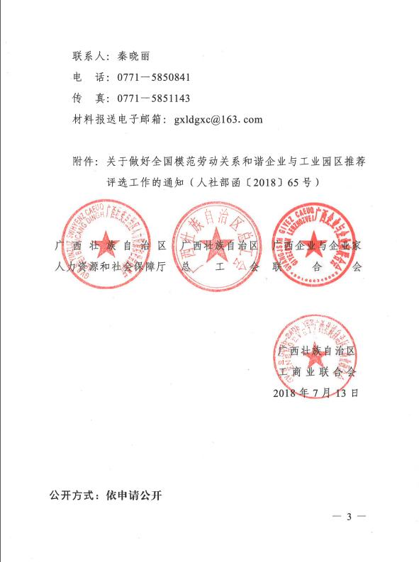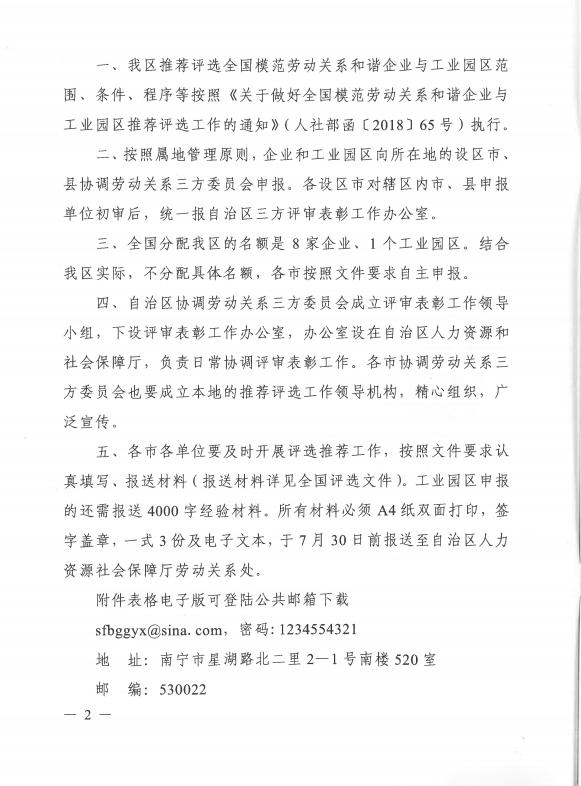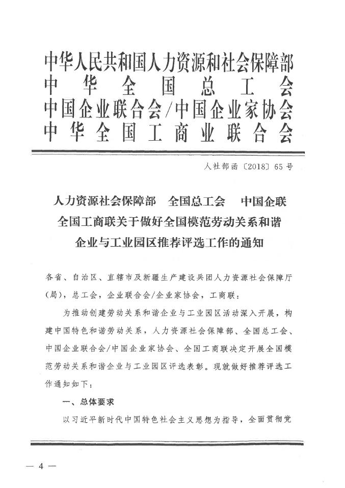 现将广西住建厅建管处转来广西人社厅、广西总工会、广西企业与企业家联合会和广西工商业联合会联合发布的《关于做好全国模范劳动关系和谐企业与工业园区推荐评选工作的通知》(人社部函[2018]65号)转发给你们,请符合条件的优秀企业于2018年8月2日前将申报材料报至我协会。(因网上通知无法上传PDF附件,且页数较多,现截取部分内容,如需全文的企业请与我协会秘书处联系。)