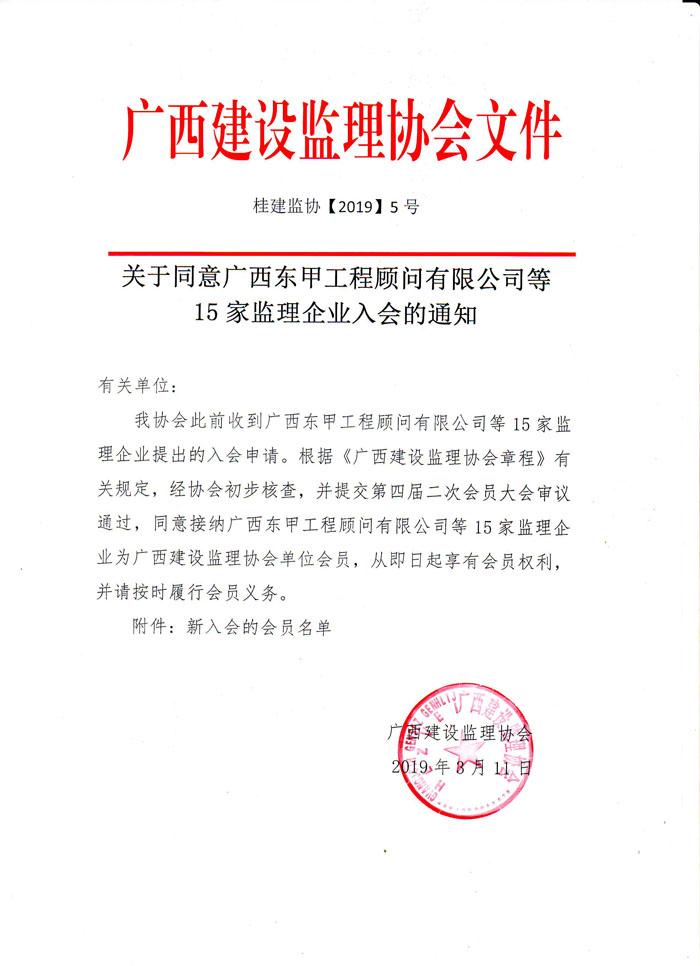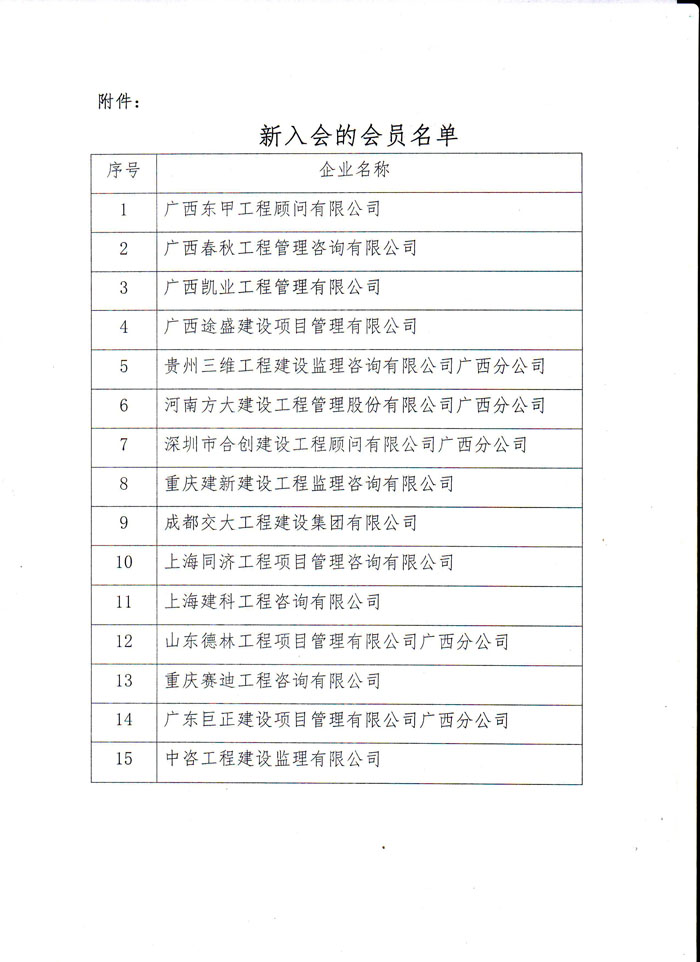 关于同意广西东甲工程顾问有限公司等15家监理企业入会的通知