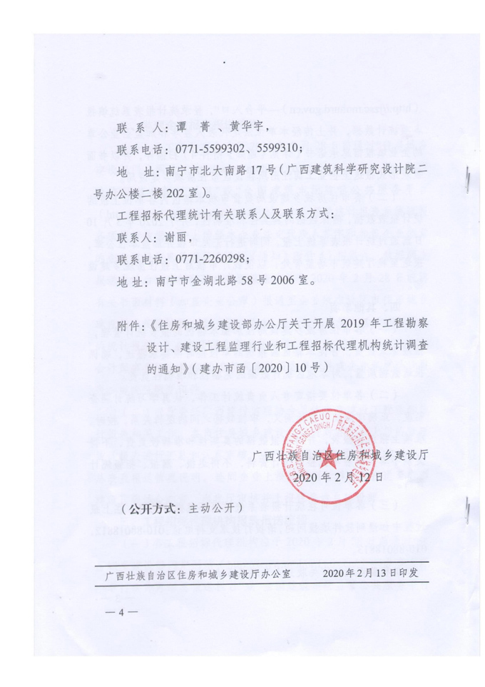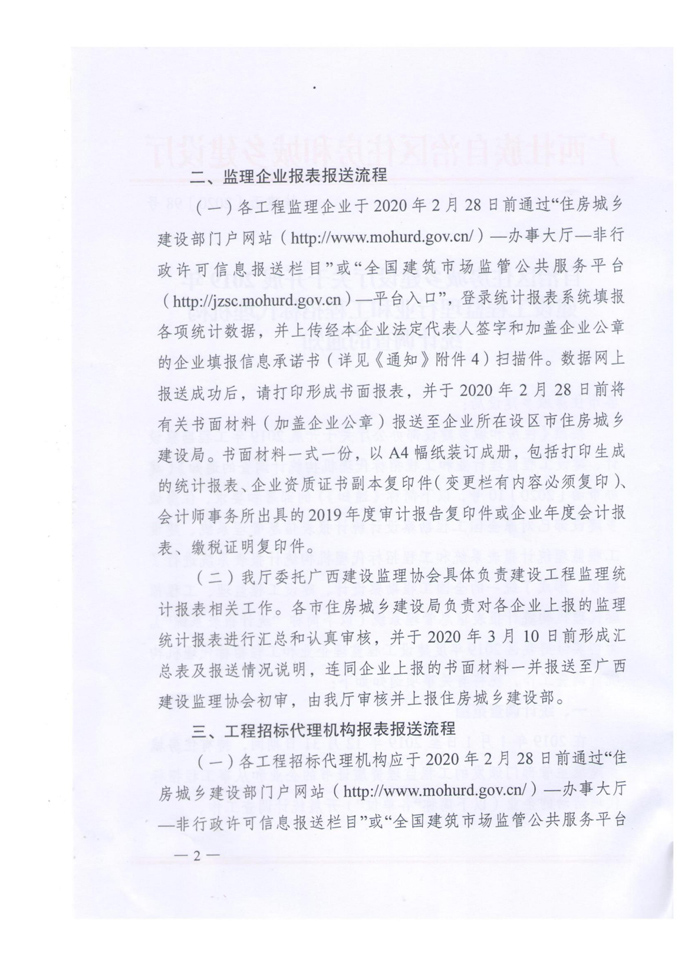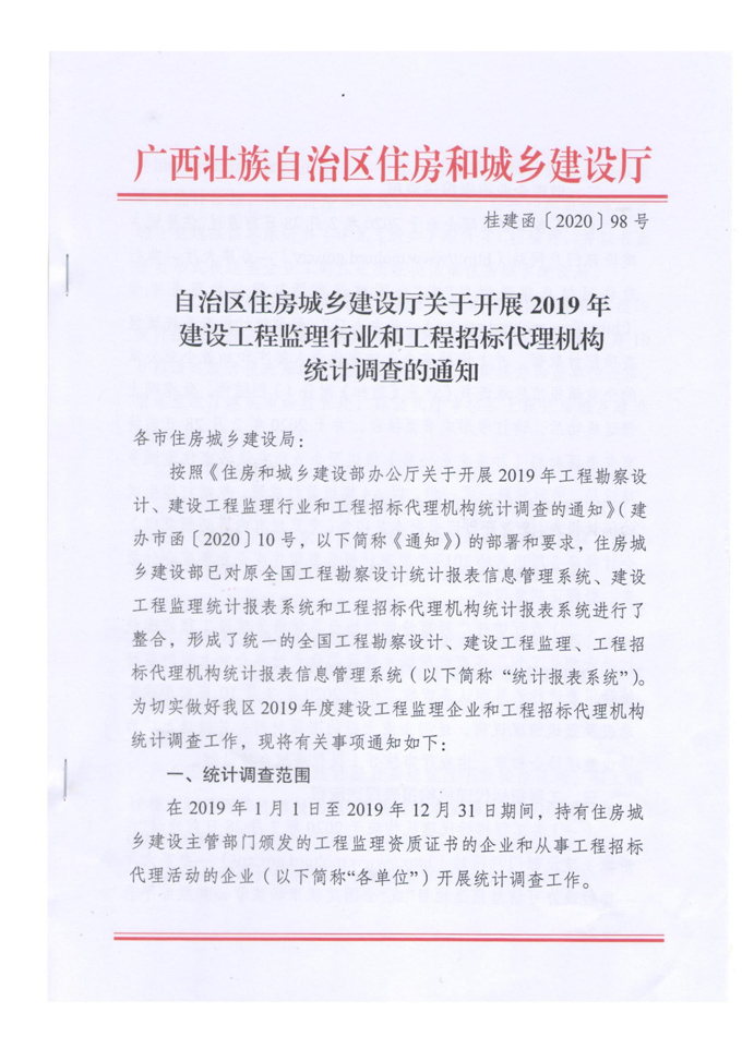 区住建厅于近期发布了《自治区住房城乡建设厅关于开展2019年建设工程监理行业和工程招标代理机构统计调查的通知》(桂建函[2020]98号),现转发给你们。因受疫情影响,根据住建部最新安排,现2019年监理统计报表企业上报时间推延至2020年3月31日截止, 各市住房城乡建设局审核及汇总时间推延至2020年4月15日截止。其余桂建函[2020]98号文件中其他要求不变.